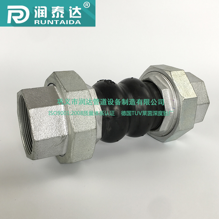 1、安裝絲扣橡膠接頭前先把需要連接的兩端管件在水平麵上放平,安裝(zhuāng)時先把(bǎ)絲扣橡膠接頭擰在其中一段管(guǎn)件上,然後在擰另一端管件,始終保持在水平麵(miàn)上,防止在安裝過程(chéng)中受力不均而撕裂橡膠球,接下來(lái)用手或者扳手把絲扣擰緊(jǐn),把絲扣橡膠接(jiē)頭和兩端管件固定在不容易拉伸或者扭曲的物體上。