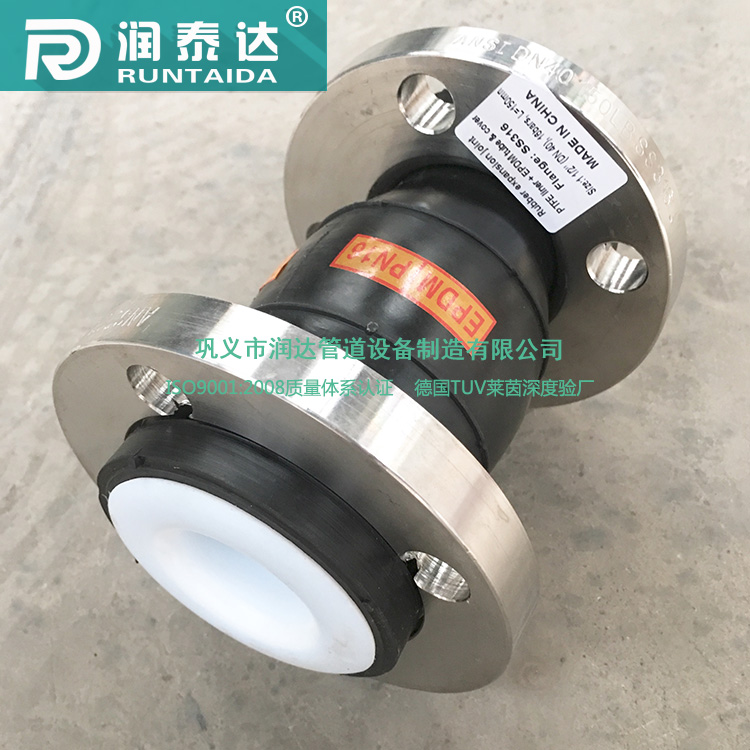 襯四氟橡膠接(jiē)頭具有減振、耐高溫(wēn)、能撓曲、耐摩(mó)擦等特點。適用於管道錯位差、位移、尺寸變化及振動部位的連接(jiē)。可作貯罐、槽車等設備(bèi)的給、排料管,還可作其它特殊之用。其使用範圍較廣泛,作用較全麵。襯氟橡膠接頭的(de)四氟具有優良的化學穩定性、耐腐蝕性,是(shì)當今世(shì)界上耐腐蝕性能(néng)材料之(zhī)一,除熔融和液氟外,能耐其它一切化學,在旺水中煮沸也不起變化,廣泛應用於各種需要抗酸堿和有機溶劑的(de)。密封性,高潤(rùn)滑(huá)不粘性、電絕緣性和良(liáng)好的抗老化耐力、耐溫優異(能在+250℃至(zhì)-180℃的溫(wēn)度下長期工作)。襯氟橡膠接頭適用於各種介質的管道連接(jiē)。